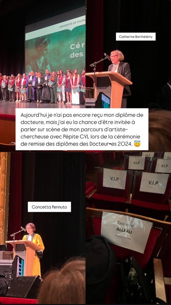 Présentation de mon activité d’artiste jeune chercheuse devant les diplômées et doyen•es de la cérémonie de remise des diplômes de docteur•es de l’université de Tours 2024. Promotion Hypathie d’Alexandrie. en photos : Catherine Barthélémy, Concetta Pennuto et la scène de l’opéra de Tours. Petit tour à Montbazon. Forteresse médiévale. Animation du premier atelier d’écriture décentrée avec Asiattitudes dans le cadre de la création d’une revue pour le projet MemorAsie. Une belle aventure. En photographies l’équipe qui y participe !Photographie du site BnF Richelieu, lieu dans lequel j’ai présenté mon travail de recherche ce mois-ci. Un magnifique lieu et de chouettes rencontres.