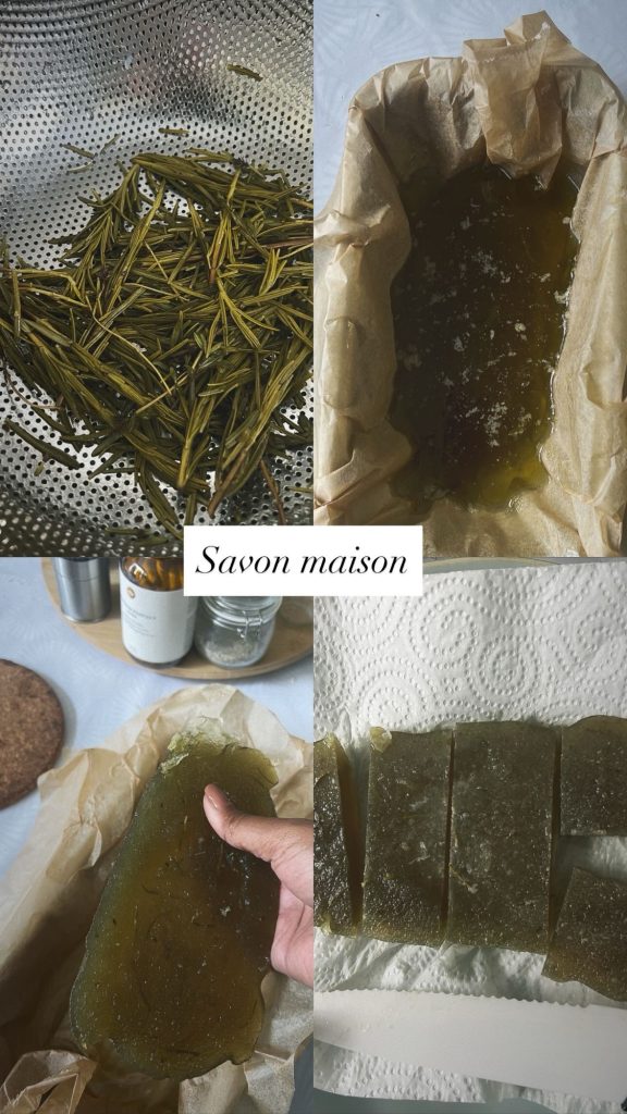 J’ai préparé un savon maison avec la base de savon Melt Bio de chez Aroma-Zone. J’ai découvert ça en naviguant sur internet, car je cherchais un moyen de valoriser quelques brins de romarin, lavande et thym du jardin, sachant que je laisse la plupart fleurir pour les abeilles et autres pollinisateurs et qu’on consomme une partie dans nos plats.