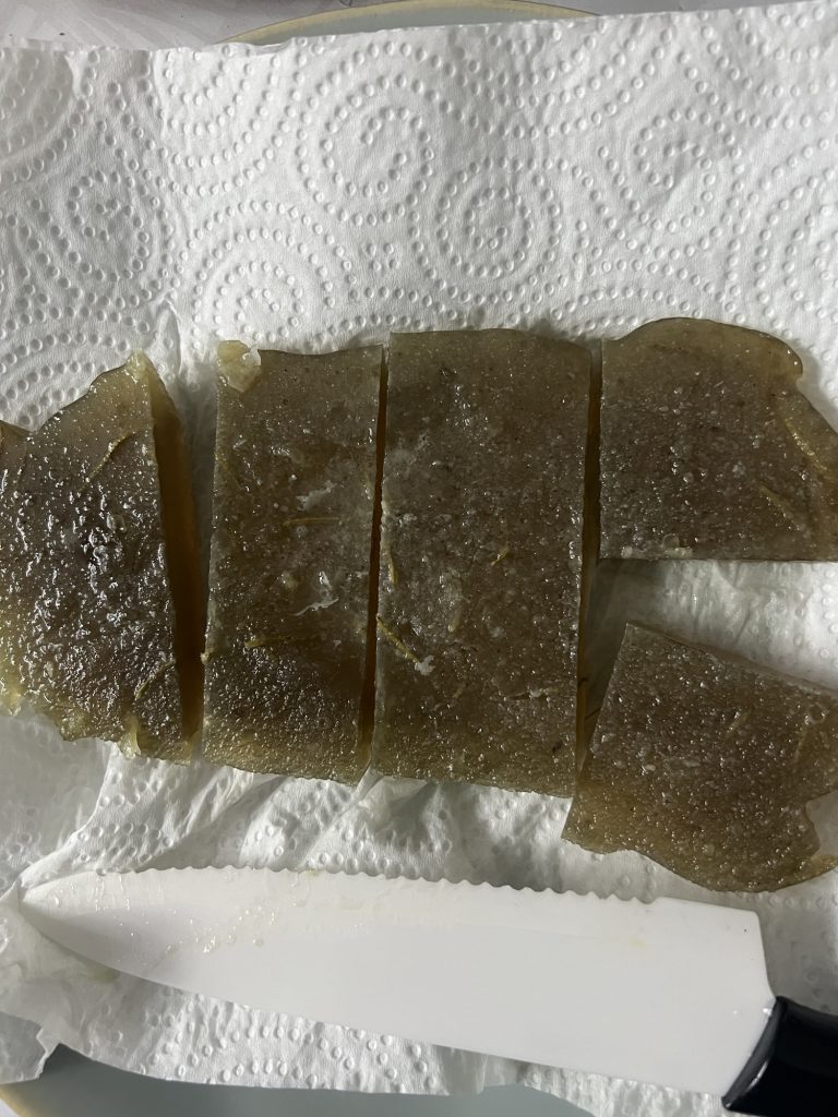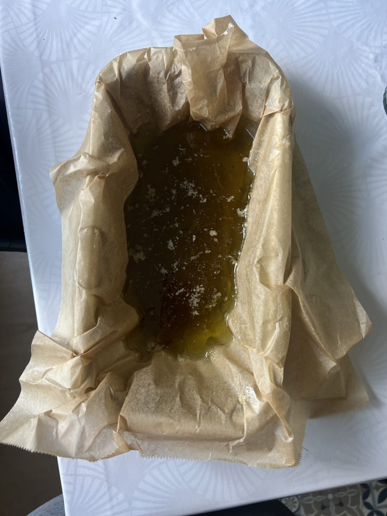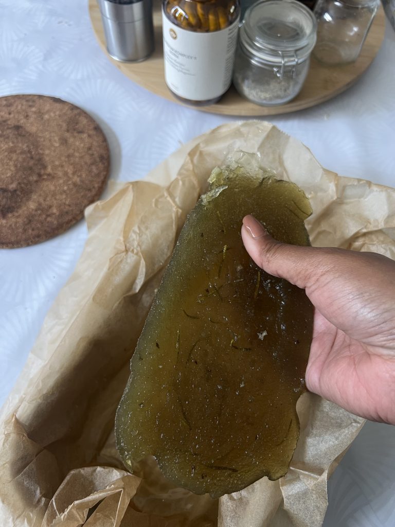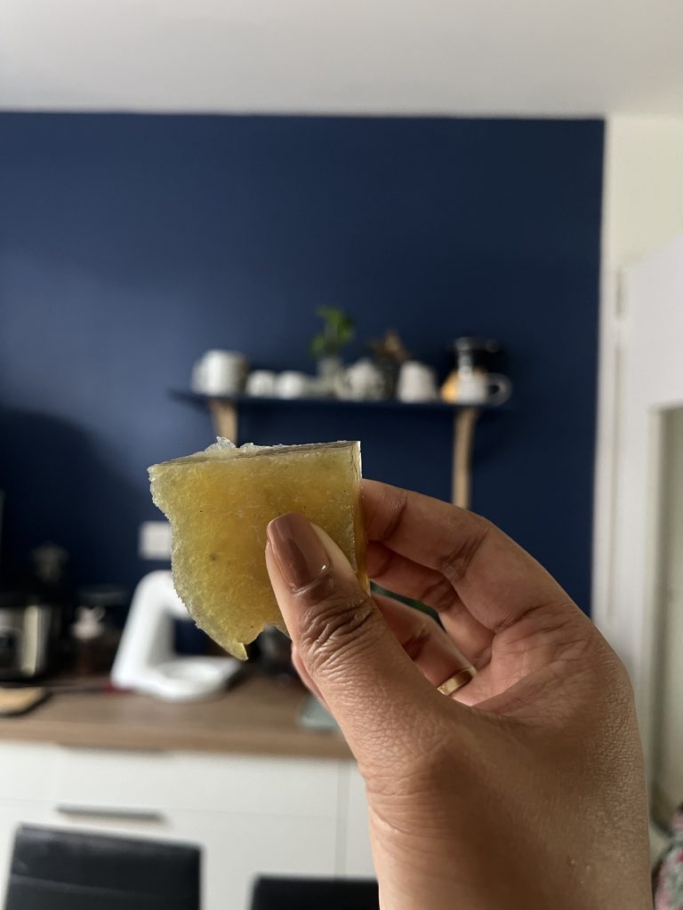 Astuce : 💚 J’ai mis la préparation dans son moule puis 35 minutes au frigo pour avancer le durcissement, même si ce n’est pas nécessaire. À température ambiante le tout durcit en 4h. Toutefois, aujourd’hui il fait très chaud, c’est pourquoi le frigo m’a semblé une bonne idée.