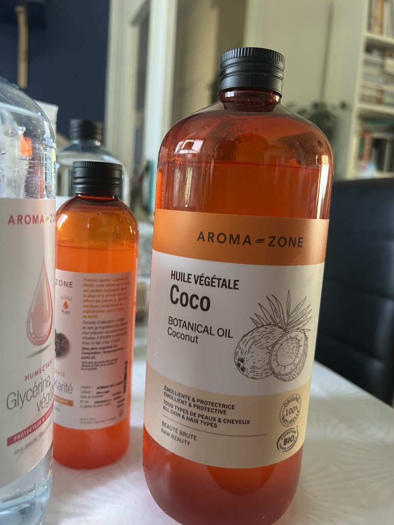 Je n’ai pas jeté le reste d’huile aromatisée. Je vais l’utiliser en crème de douche hydratante. J’ai réservé l’huile dans un récipient dans le frigo en attendant d’avoir un contenant de la salle de bain vide à remplir avec. J’ai ajouté dedans un tensioactif moussant et une préparation végétale pour gel douche.