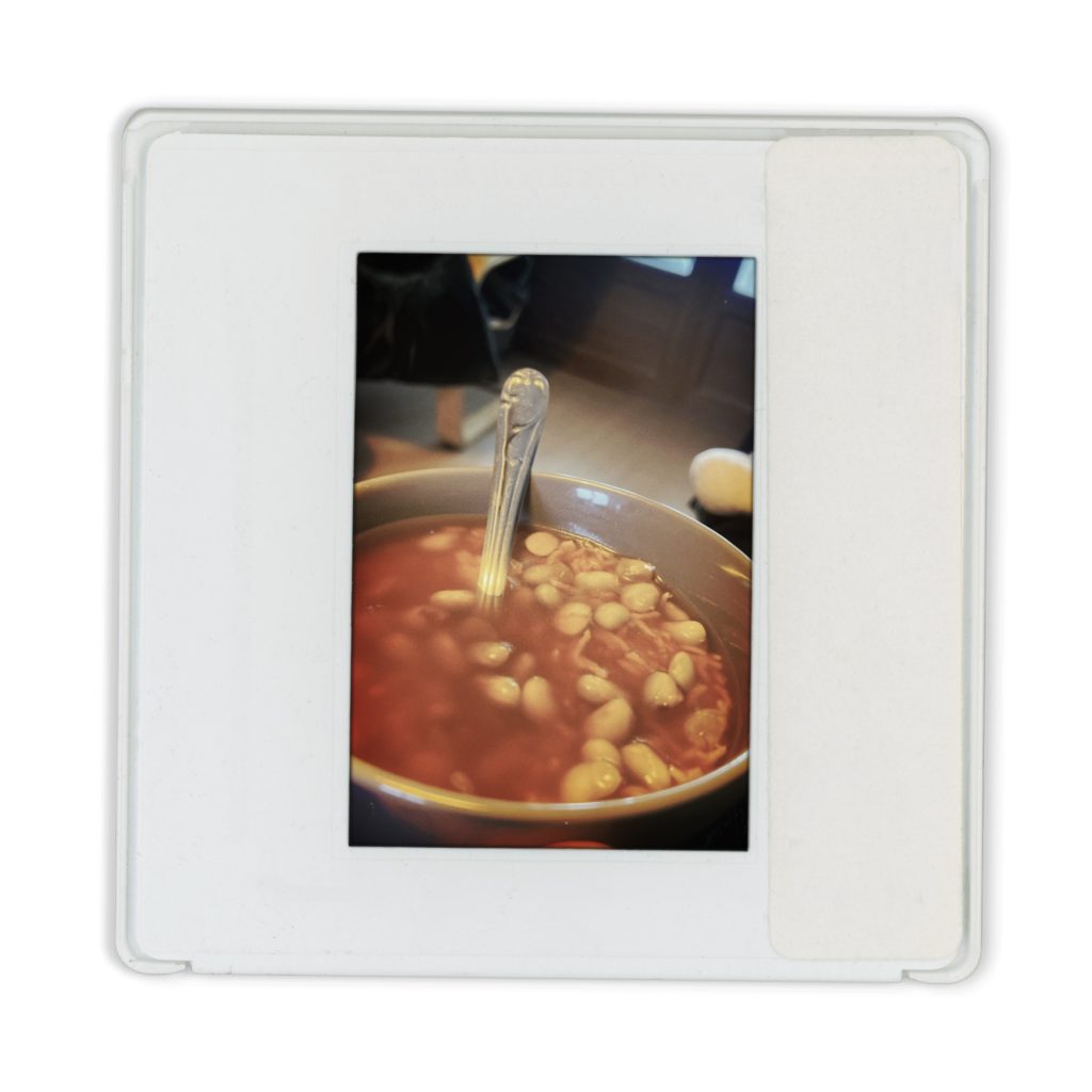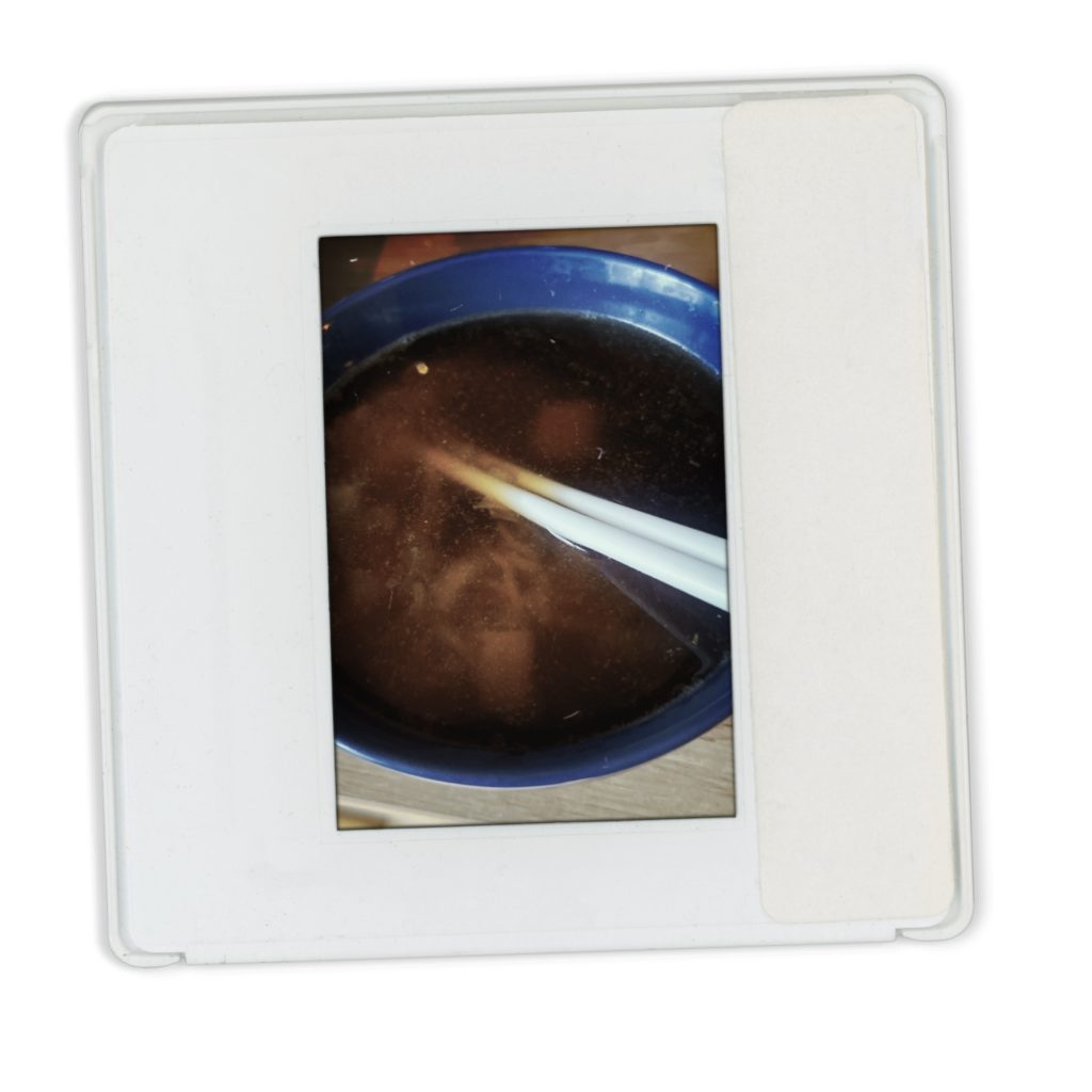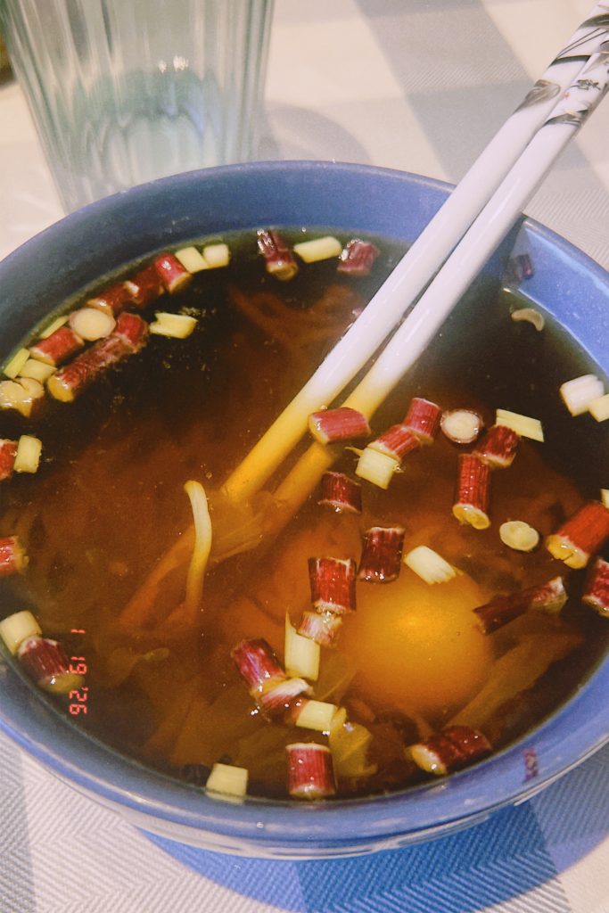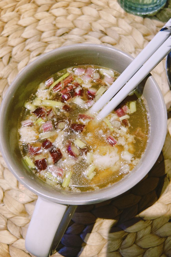 - des restes de la veille ; par exemple du pain ou du riz de la veille, des légumes de la veille plongés dans l’eau bouillante du bouillon soja.